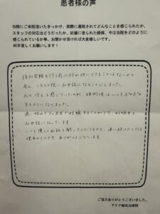 また、ポジティブな心かけをしてくださることがほとんどで、治療期間中ネガティブになることが多々ありましたが、たくさん励ましていただきました。