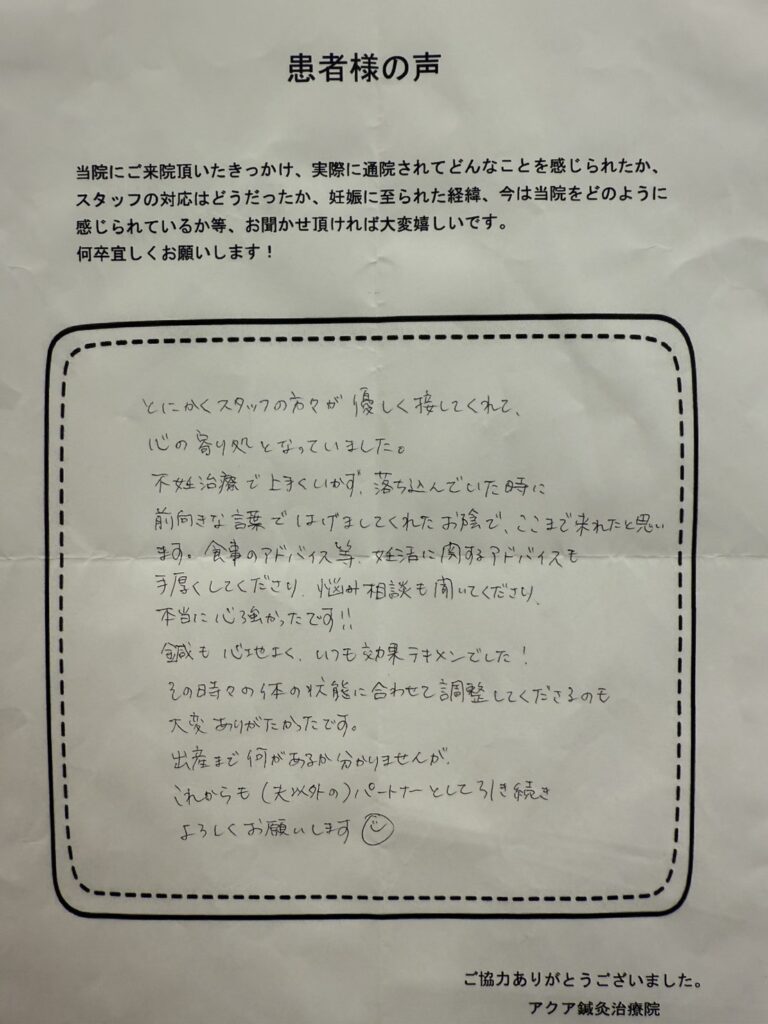 食事のアドバイス等、妊活に関するアドバイスも手厚くしてくださり、悩み相談も聞いてくださり、本当に心強かったです!!