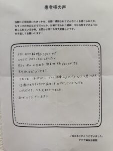 治療はもちろんですが、食生活のアドバイスなどもいただけて、とても助かりました。